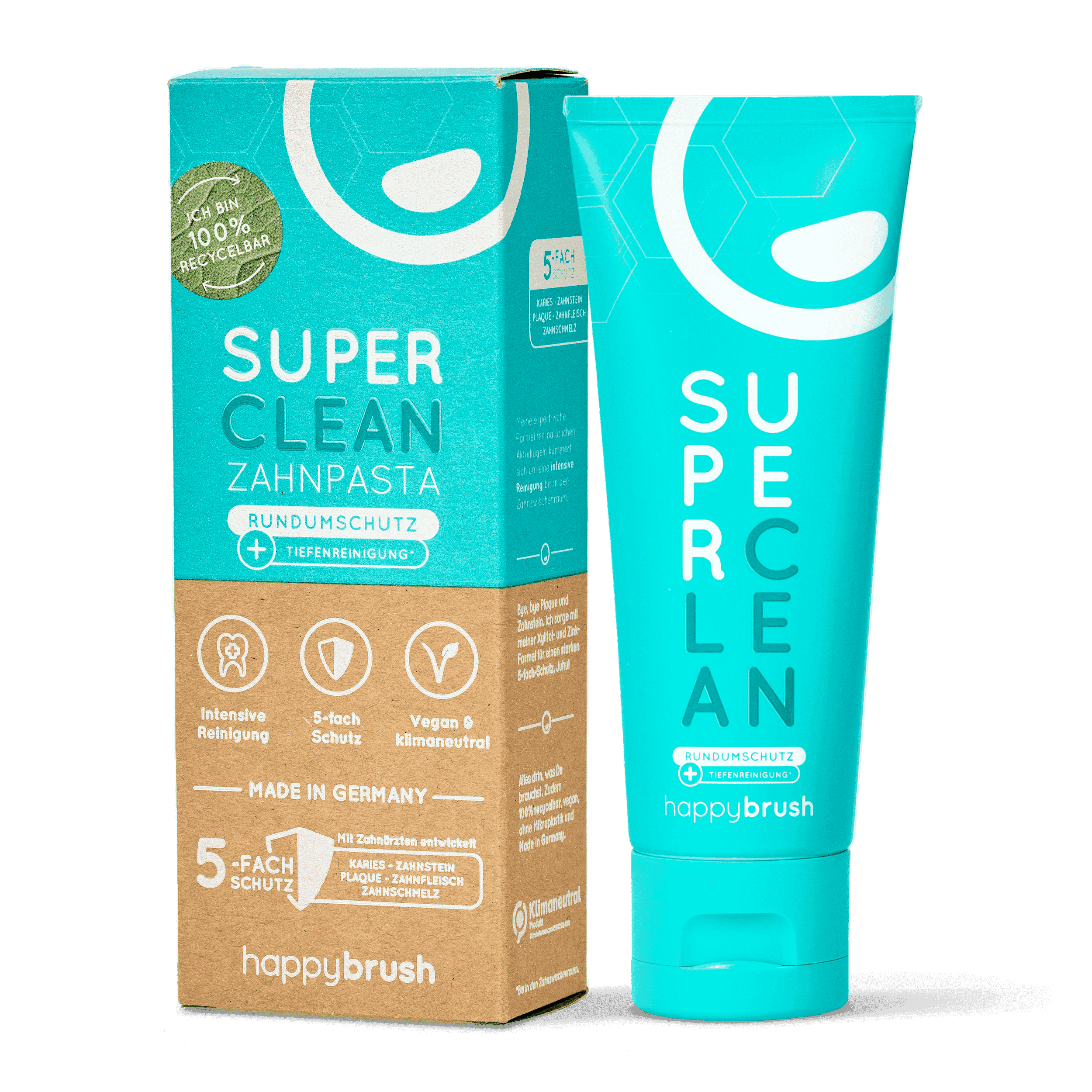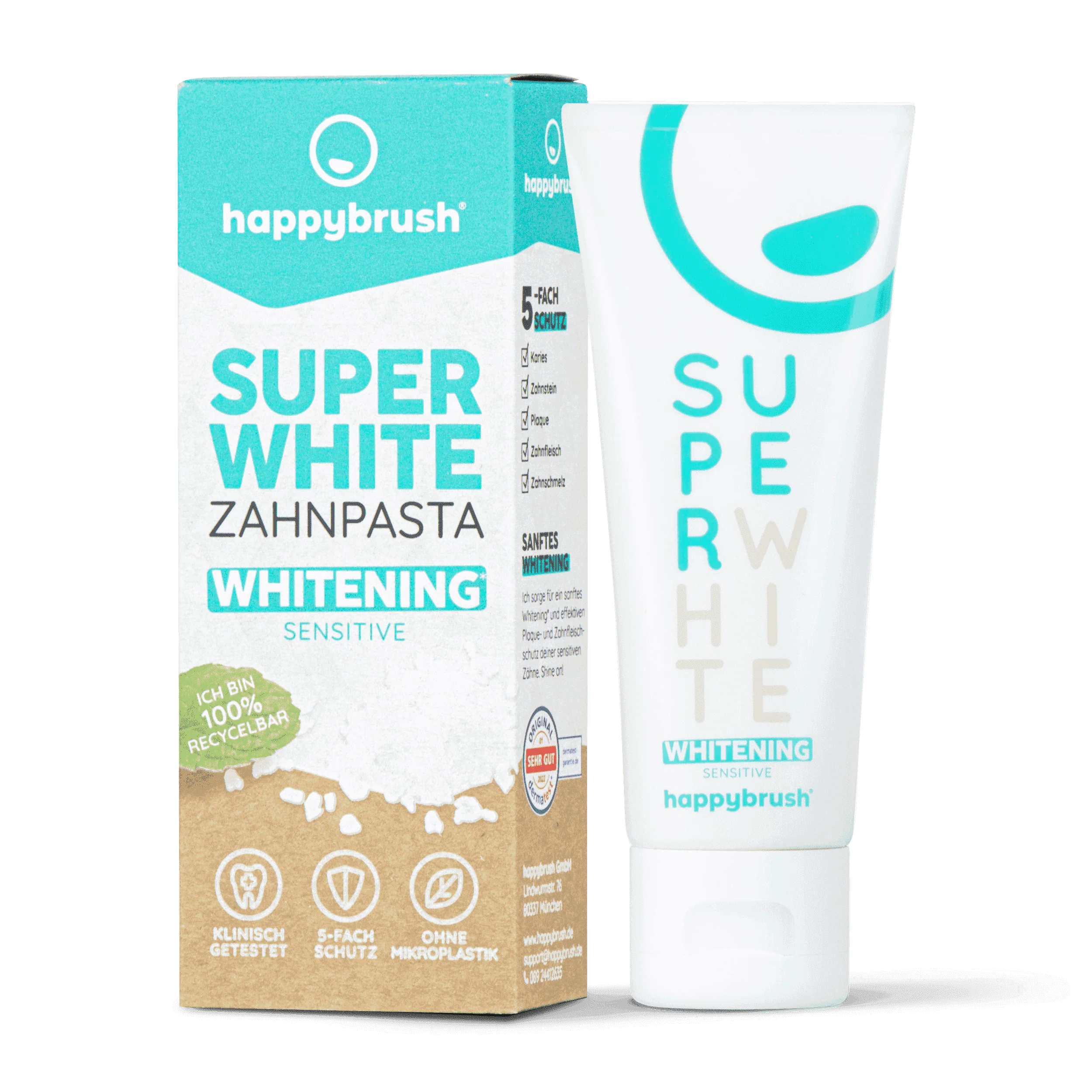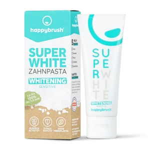 Die veganen Zahncremes von happybrush sind gut für Zähne und Umwelt! Die 100% vegane und glutenfreie Zahncreme ist in einer 100% recyclebaren Tube verpackt! Wenn Du Kaugummis magst, wirst Du die SuperWhite Whitening Zahncreme lieben, denn ihr Cool Mint Geschmack sorgt für frischen Atem und die Kieselsäure-Formel wirkt durch sanftes Bleaching als natürlicher Zahnaufheller.